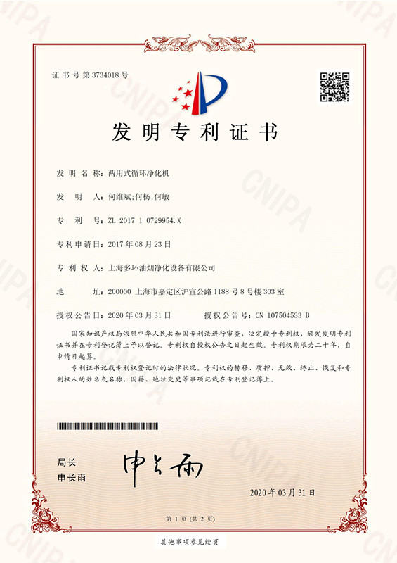 喜報(bào)!喜報(bào)!熱烈祝賀無(wú)煙管內(nèi)循環(huán)油煙凈化機(jī)行業(yè)開創(chuàng)企業(yè)上海多環(huán)油煙凈化設(shè)備有限公司再次獲得國(guó)家發(fā)明專利授權(quán)。